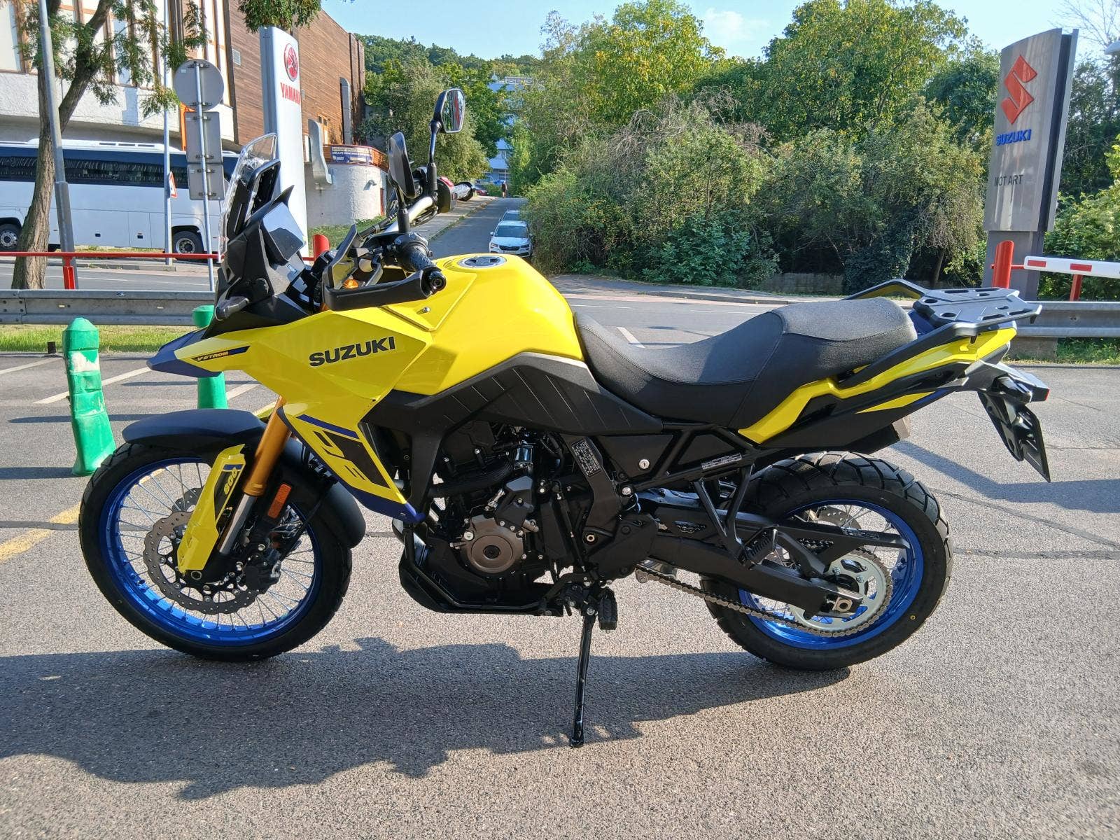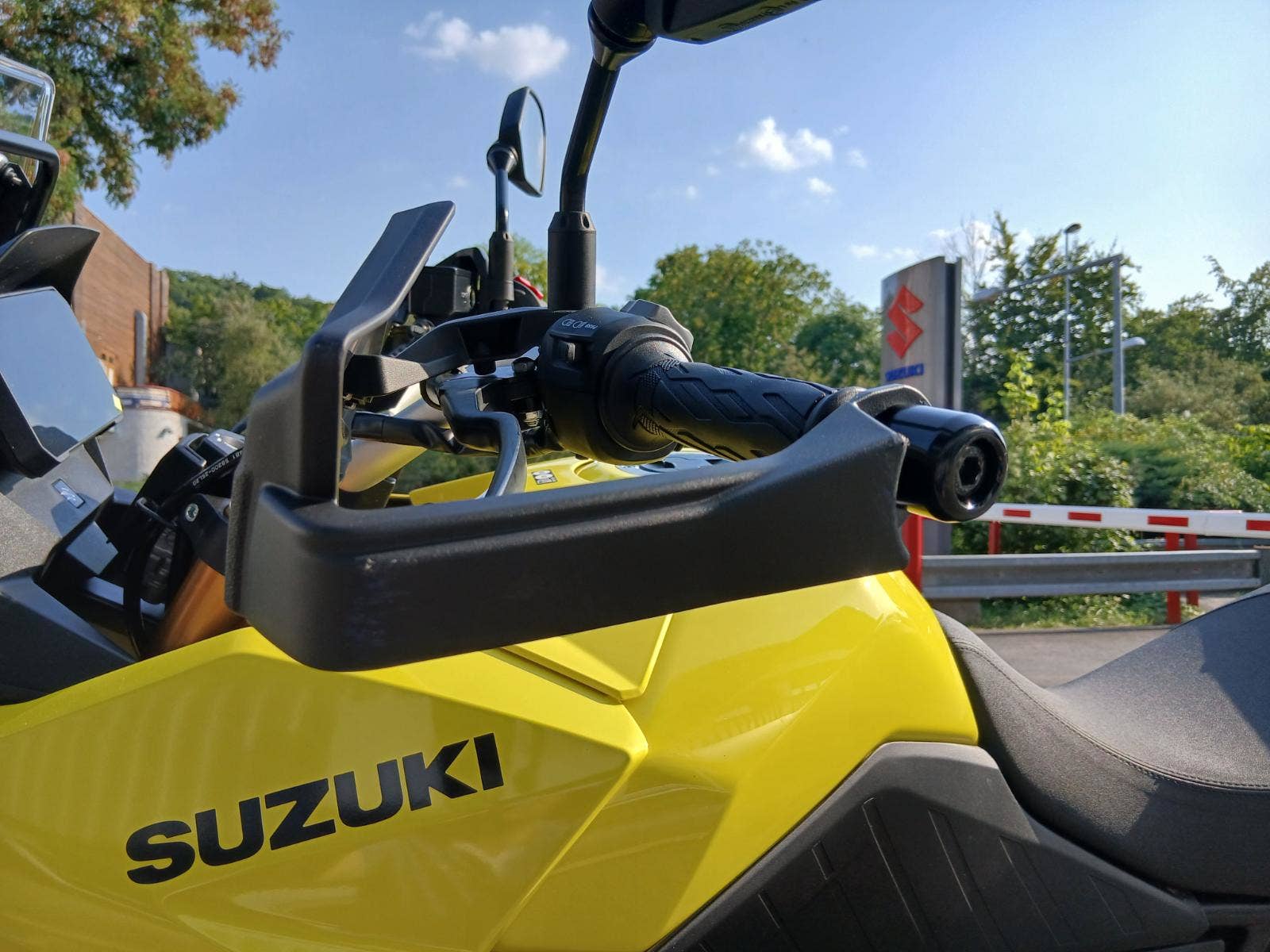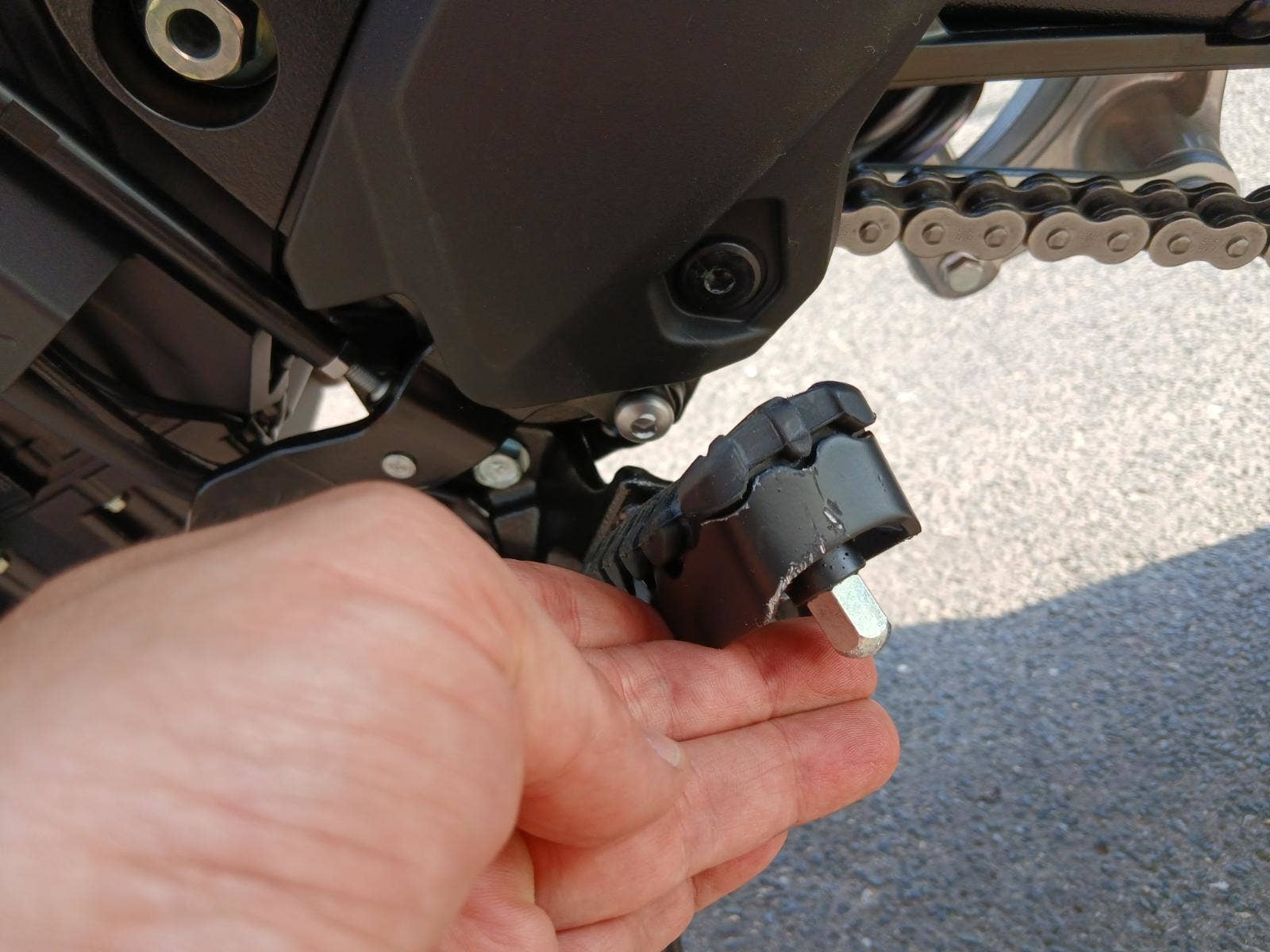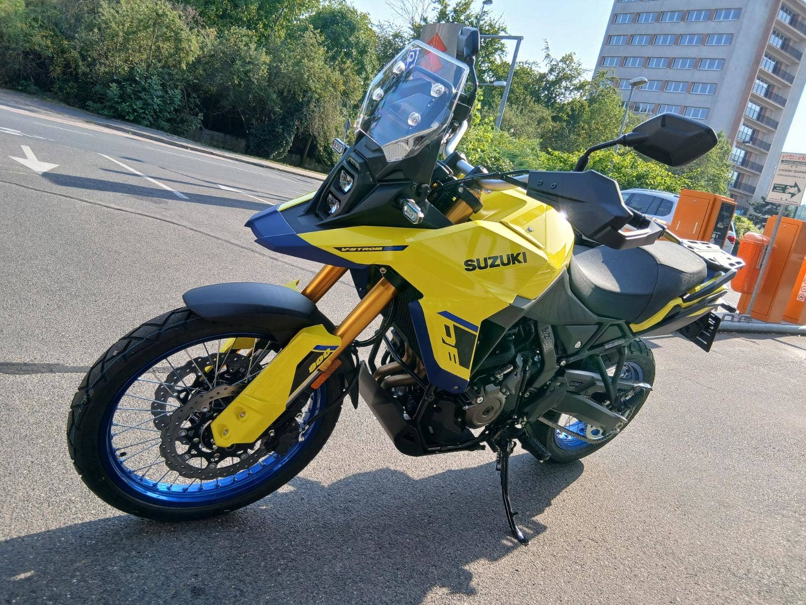 Má poškození dle fotografií: škrábnutý žlutý boční plast, jemně poškozený kryt páčky, stupačka řidiče a spolujezdce. Nic dalšího.